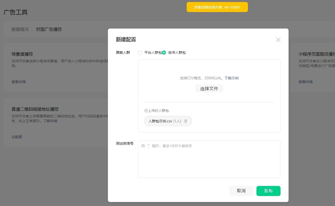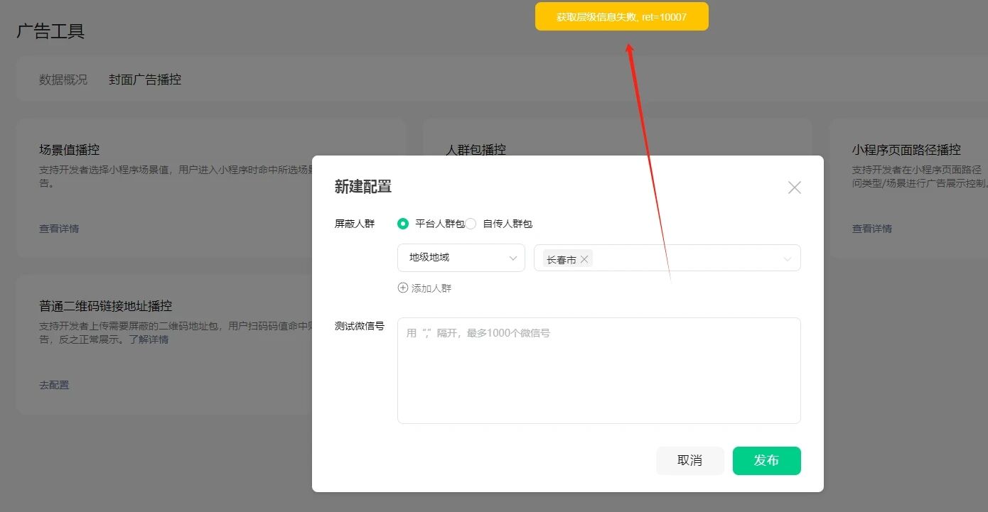 我的小程序接入了流量主的封面广告,现在广告展示正常,但是想屏蔽一些用户不展示广告,在小程序web分析后台->经营工具->广告工具->封面广告播控->人群包播控设置,一直没办法设置,报错《获取层级信息失败,10007》,麻烦看看是什么情况,谢谢