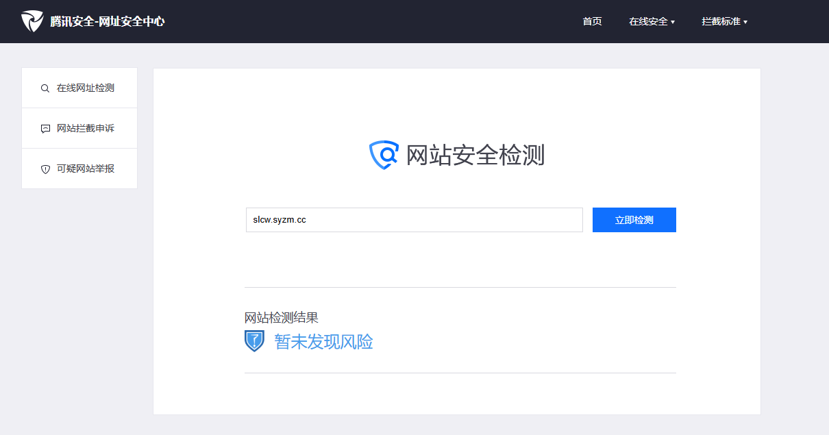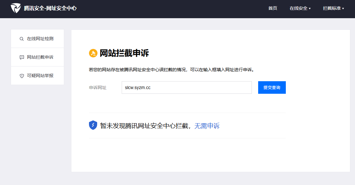 各位审核员们好!本网站域名地址(syzm.cc备案号蜀ICP备2025137401号)在微信端打开显示被拦截,内容经自检无任何违规,腾讯官方检测也未发现风险,SSL证书也安装完成。烦请管理员审核解除一下拦截,感谢!(这是其中一个按钮的链接地址:https://slcw.syzm.cc/?code=081FAtFa12M6GK0VDHFa1txtb00FAtF7&state=STATE#/OnlineExpert)