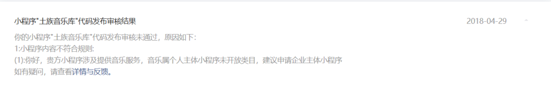 但是,发布小程序后因没有企业相关资质而未通过,详见下图: