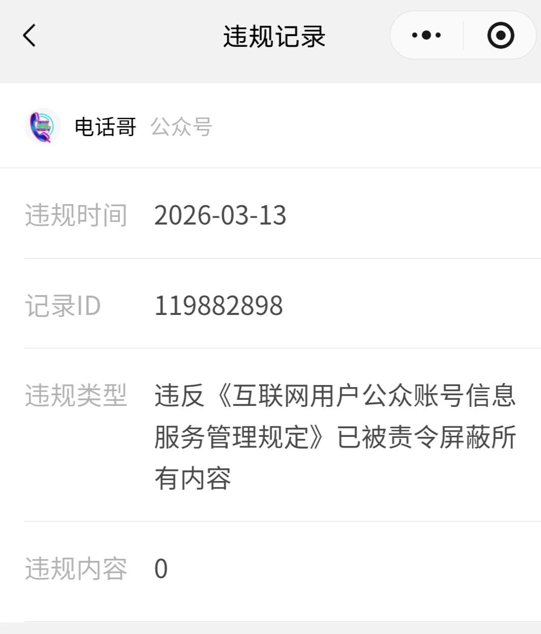 笔者的公众号在2026年2月14日因文章违规,被处罚封禁至3月16日。在3月13日再次接到违规通知,违规内容为零,追加封禁期限至3月28日。经过申诉,结果是不予通过。回复中提到是有用户投诉,这个回复实在经不起推敲。众所周知,公众号被封禁期间,笔者无法发布任何信息,亦不可以查看 ,是什么“用户”可以在封禁期间查看并投诉,实在难以置信。笔者愿意相信,上述问题可能属于系统误判,恳请平台核实后按时予以解除封禁,谢谢!