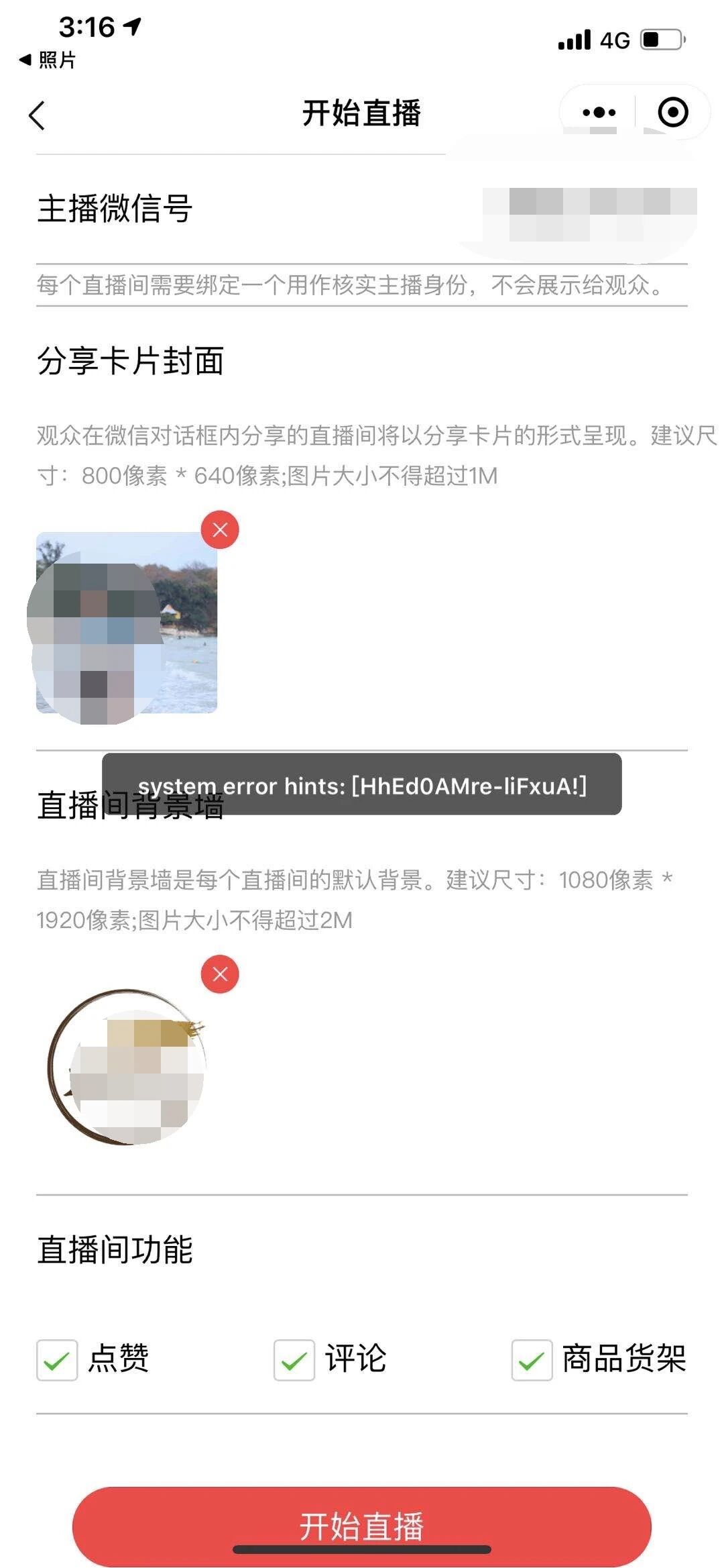 你这不上代码 谁能给你解答啊 第一个是系统错误 第二个是填写的微信号没有在小程序直播里实名认证啊