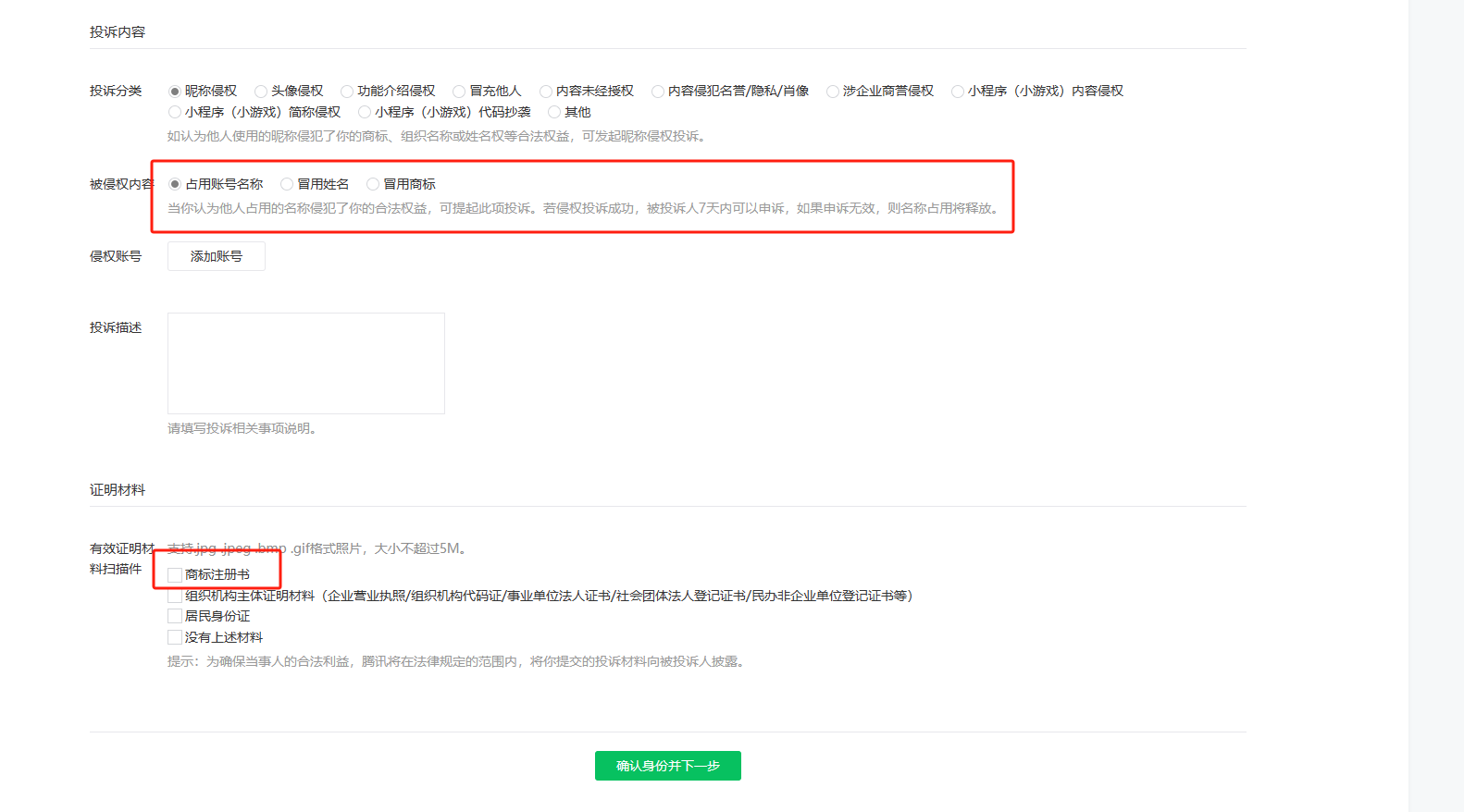 同时侵权投诉的类别应该选择哪一类,如果是“昵称侵占”需要提供商标注册书,但我们目前只有软件著作权。