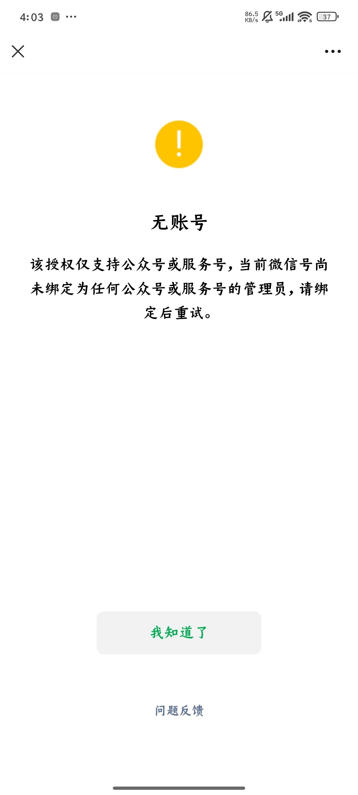 你好,请参考https://developers.weixin.qq.com/doc/oplatform/Third-party_Platforms/2.0/troubleshooting/authorization_troubleshooting.html#%E4%BA%94%E3%80%81%E5%95%86%E5%AE%B6%E6%8E%88%E6%9D%83%E6%8F%90%E7%A4%BA%E6%97%A0%E6%B3%95%E6%8E%88%E6%9D%83%E3%80%81%E6%97%A0%E8%B4%A6%E5%8F%B7自助排查