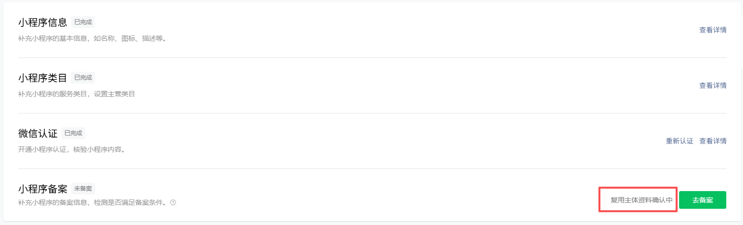 更多复用主体资料流程详情:https://developers.weixin.qq.com/miniprogram/product/record/record_faq.html#%E5%8D%81%E4%B8%80%E3%80%81%E5%B0%8F%E7%A8%8B%E5%BA%8F%E5%A4%87%E6%A1%88%E5%A4%8D%E7%94%A8%E4%B8%BB%E4%BD%93%E8%B5%84%E6%96%99%E5%8A%9F%E8%83%BD%E7%9B%B8%E5%85%B3