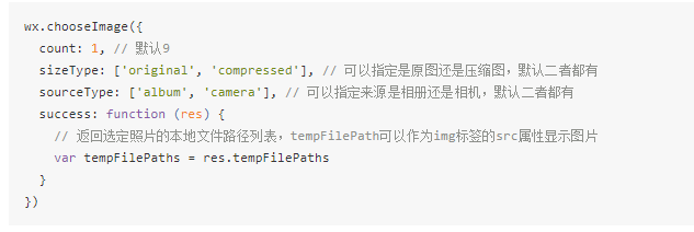 wx.chooseImage({ count: count ? count : 9, // 默认9 sizeType: ['original', 'compressed'], // 可以指定是原图还是压缩图,默认二者都有 sourceType: ['album', 'camera'], // 可以指定来源是相册还是相机,默认二者都有