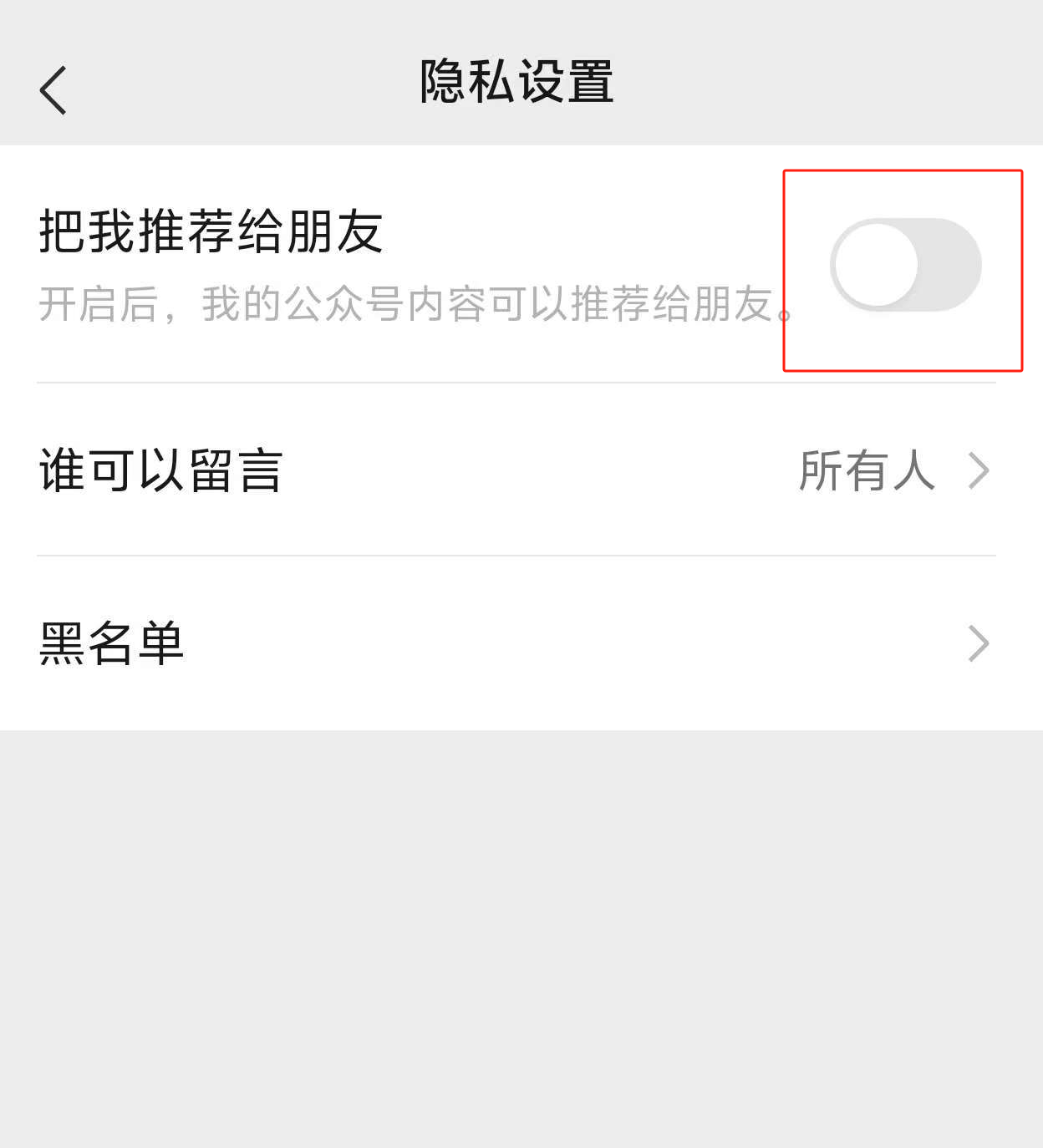 你好,可在我的公众号隐私设置里关闭