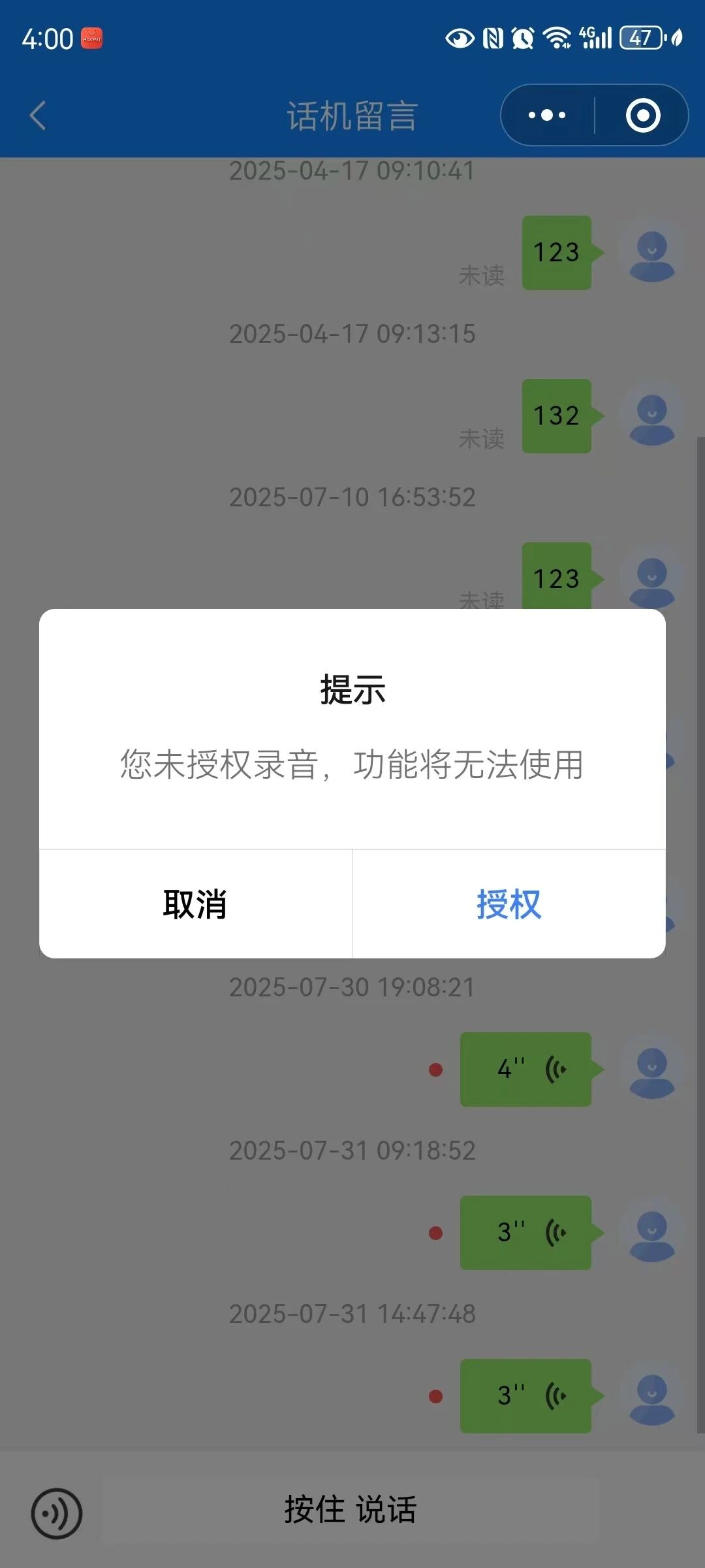 2.点击同意,弹出wx.authorize中检测的scope.record权限未授权,并没有见到正常的获取麦克风权限的授权弹框