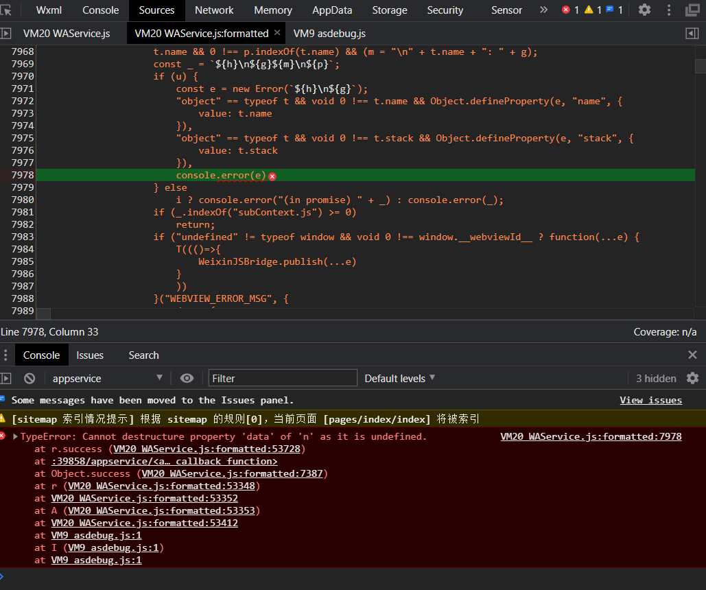 VM20 WAService.js:formatted:7978 TypeError: Cannot destructure property 'data' of 'n' as it is undefined.