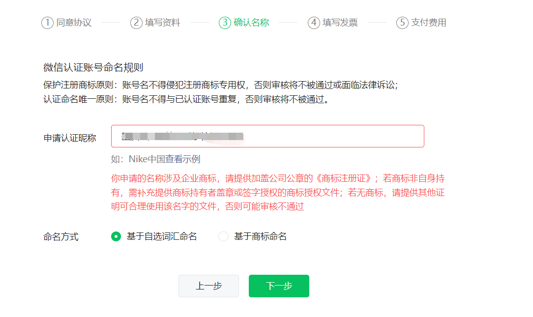 就是你这个公众号的名称被其他人注册商标了,你要继续使用,就要联系这个注册商标的人要授权书,或者这个商标是你们公司注册的,选择基于商标命名,然后上传商标证书就行;要是没有这些资料只能修改公众号名称了