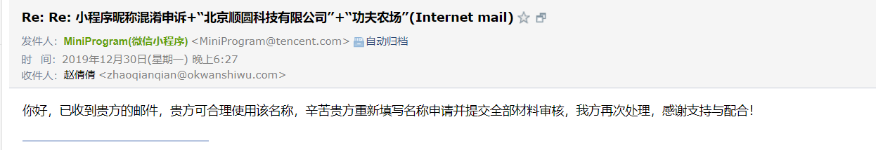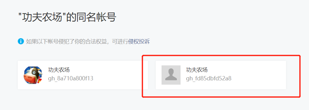 2月1日在微信小程序后台进行侵权账号投诉,今日反馈说投诉不通过,我方的《富豪庄园》小程序修改为《功夫农场APP》一直不通过。我方拥有对《功夫农场》的所有权和开发权,同时也上传了相关的证明材料,小程序的注册是我司授权个人进行注册办理的,公众号则为企业注册办理,但是我方已上传了我司对个人的授权书。