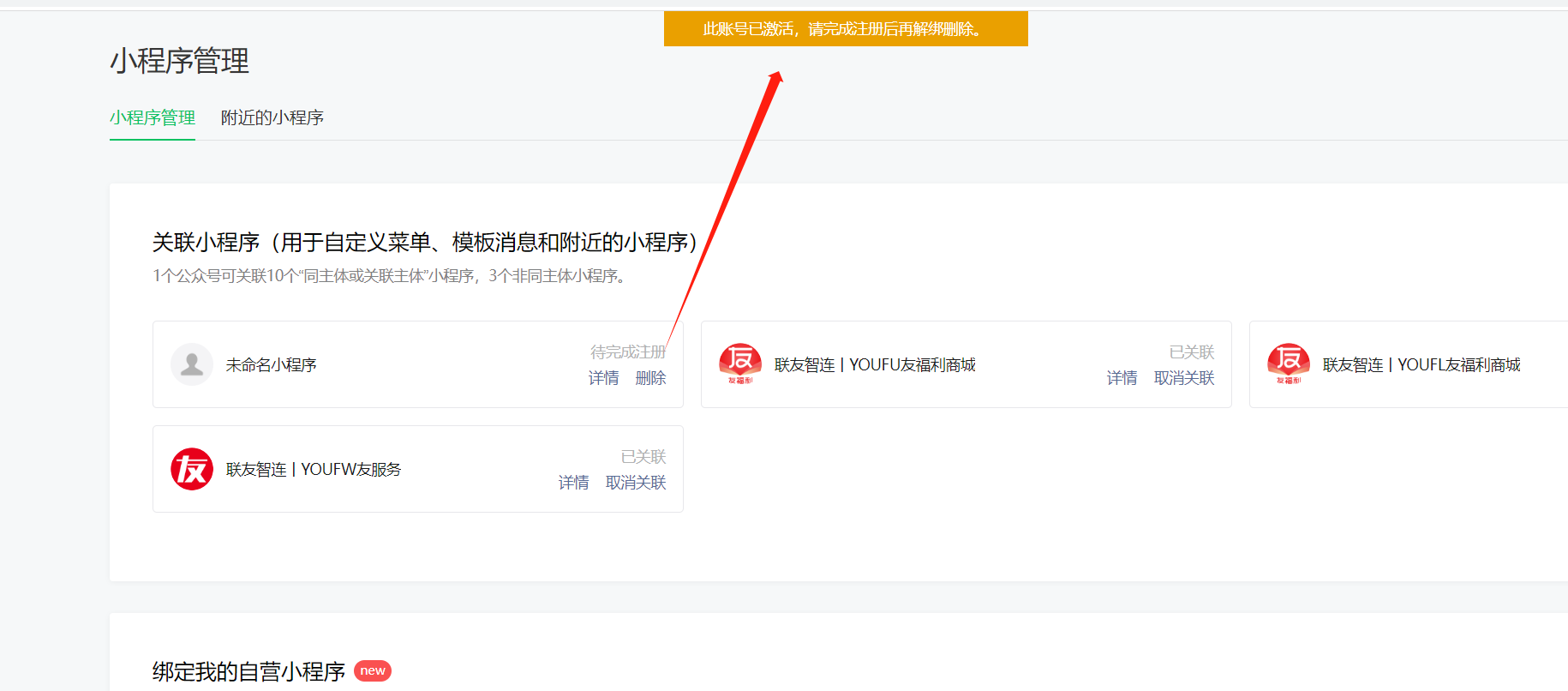 然后小程序管理里面这个未命名的小程序删除不让删除,提示"此账号已激活,请完成注册之后再删除"