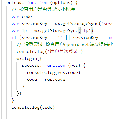 正常按照顺序执行的话应该是会给code赋值,但是现在应该是wx.login 单独执行,我尝试使用存入缓存中,直接执行读取缓存的代码是看不到code的,在Storage中是有数据的。应该是这个先执行了console.log(),然后在执行的存入数据。
