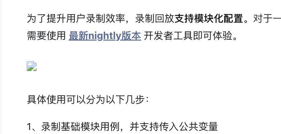 为了提升用户录制效率,录制回放支持模块化配置。对于一些多个Case公有的部分,可以抽出来做基础模块来管理,可以避免重复的录制操作。注意需要使用 最新nightly版本 开发者工具即可体验。