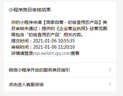 案例2:该小程序涉及为企业或个人提供网上交易的平台或涉及实物众筹。需提供《增值电信业务经营许可证》资质文件,并重新提交审核补充电商平台类目。