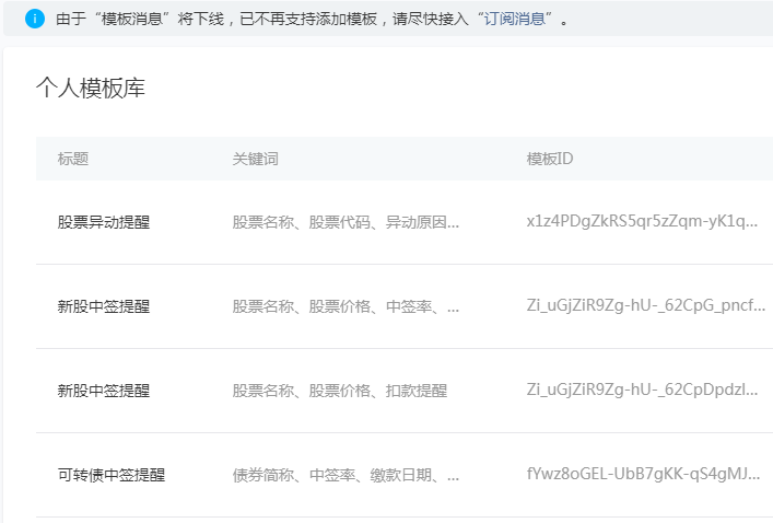 这几个模版,在订阅消息里,一个也搜不到,既然模版消息要下线,我们也能理解,但是原来能发送的,在新的框架下也得给一个平滑迁移的方案吧?