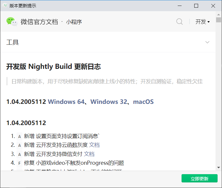 开发版 Nightly Build 更新日志 | 微信开放文档