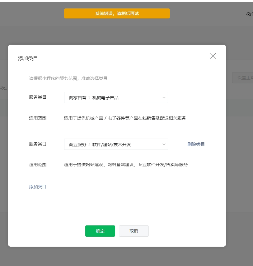 你好,建议可退出后重新登录,或更换浏览器,再重新申请对应类目,看是否还会报错,如仍报错,建议提供下完整的录屏,以供进一步定位情况。