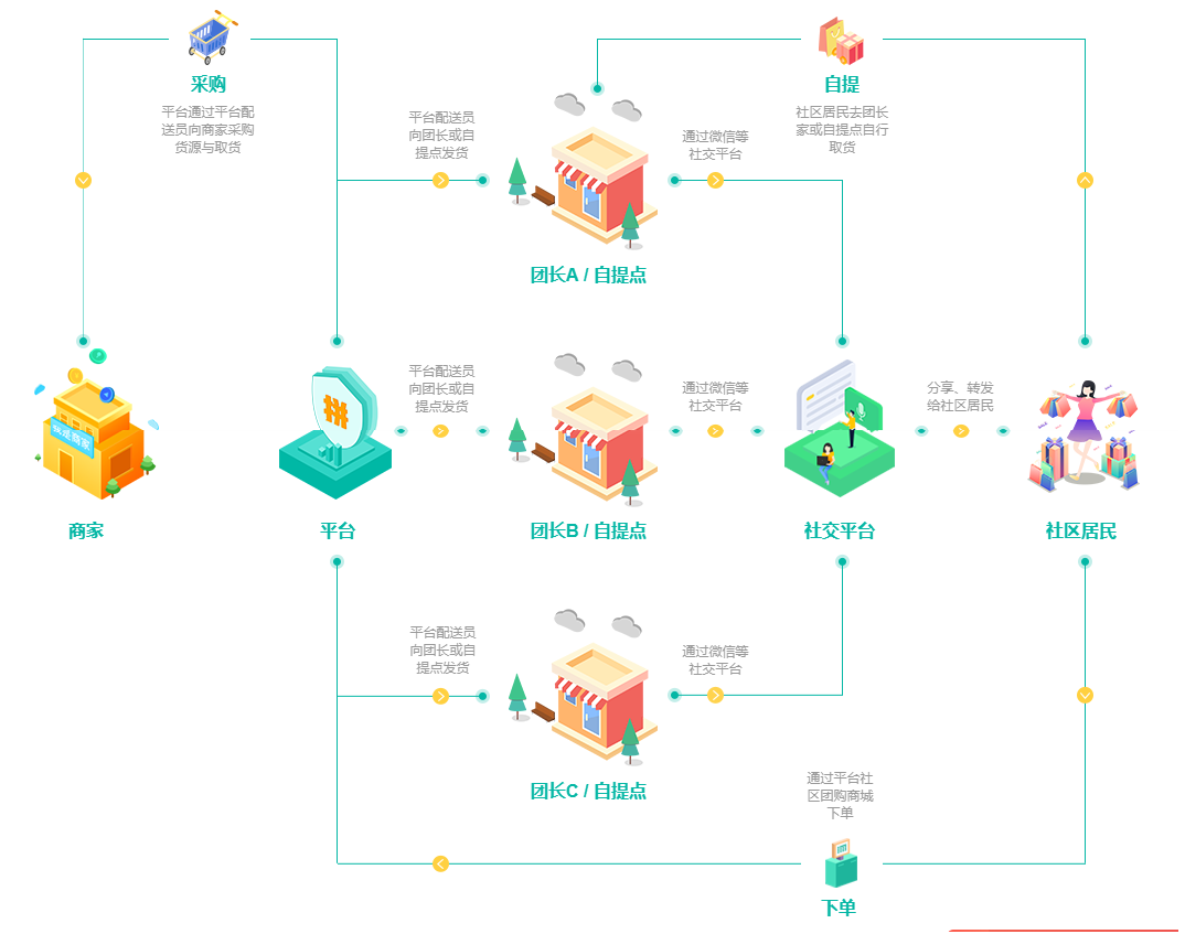 【社区团购】,是以微信为载体整合多个社区社群资源,形成由商家集中化管理运营的预售+团购的社区商业模式。主要销售场景是由各快递代收点、社区便利店、社区物业、业主等发起的社区微信群,每个群都相当于一个社区店。通过帮助商家搭建商城平台,从系统后台把商品快速覆盖至每个社区店,再由各社区店主将商品推销至社区居民,从实际层面解决订单、配送、备货、提货、售后、结算等环节导致的痛点;致力于帮助商家把「社区团购」做得更加规范、高效,从中获得更大的收益!