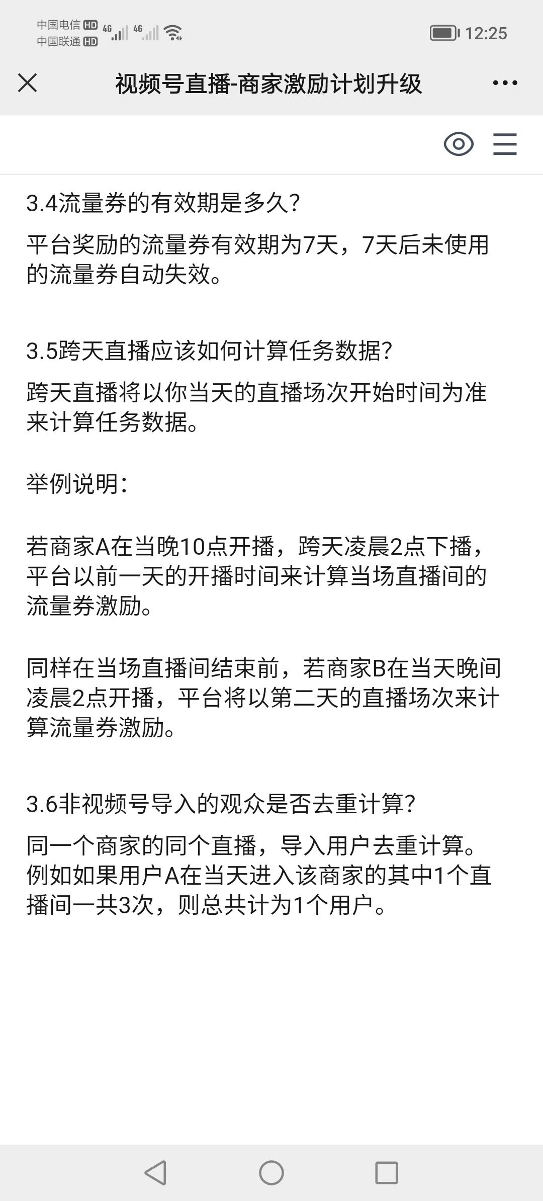 视频号直播有时刻限制的?晚晚规定这个时间直播真的拿自己的命,什么激励活动理应不限时间,不限时段,这是一种强逼性任务,人,晚晚熬夜多此终拿自己的命,为了做一点生意拿自己的命值得吗?官方本来就要免费推流才对的,在任何时候来说,把视频号直播挂红包的组件取消,换过积分换礼品,例如:一件商品68元就是60积分,按积分兑换商品,这样还可以吸引住消费者,挂红包的根本没有用,进来的大部分都是抢红包,抢完就走,根本没人看,因为我们是男人,有谁看男人直播,除了口才好的讲师或美女大把人看,想商家的发展更好的,积分兑换商品,假如:消费者买了一件商品68元就能得到68积分,就能兑换68元的商品,但平台一定要给回商家的补贴,这是一举两得?视频号开发者动一动脑什么叫商业发展模式,你们懂得开发,不一定懂得市场上的商业消费发展模式。