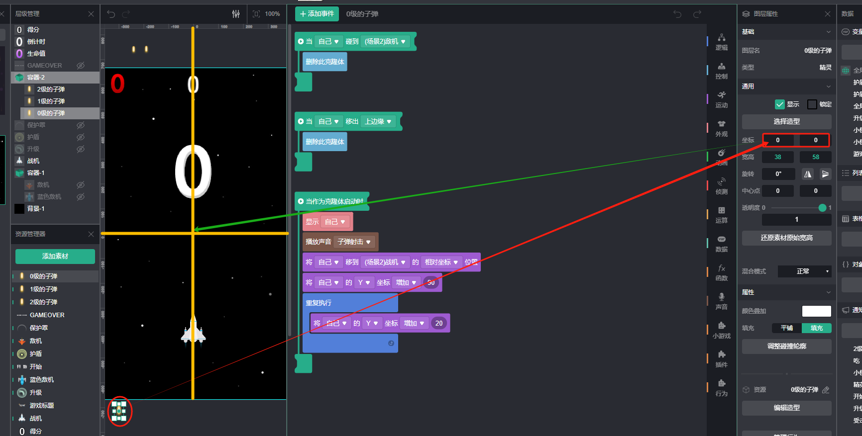 事情是这样的:我想给飞机做个子弹,但是这个子弹它认为自己0轴在这个位置(红圈位置)正常情况应该在正中心吧(绿箭头位置)