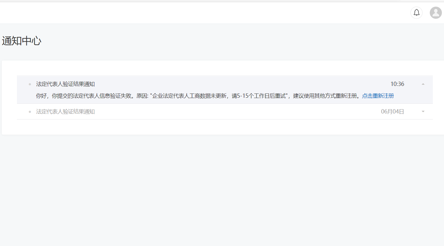 你好,你提交的法定代表人信息验证失败。原因: "企业法定代表人工商数据未更新,请5-15个工作日后重试