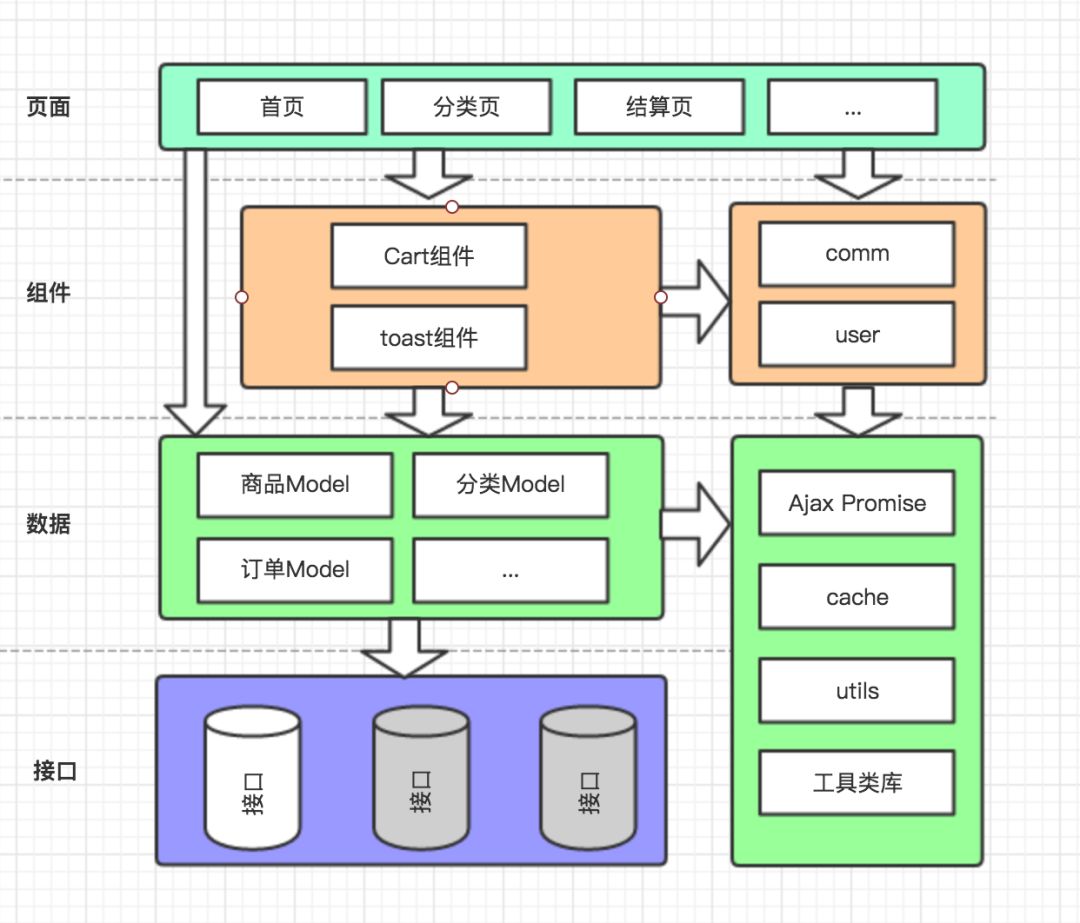 Web开发做得多了,你就会发现,大部分工作就是取数据,渲染UI,处理交互这三件事儿,小程序也不例外,所以按照这个框架逻辑,我们基于小程序本身的框架规范又扩展和细化了下,设计了下面的这套可直接应用于项目的开发框架。