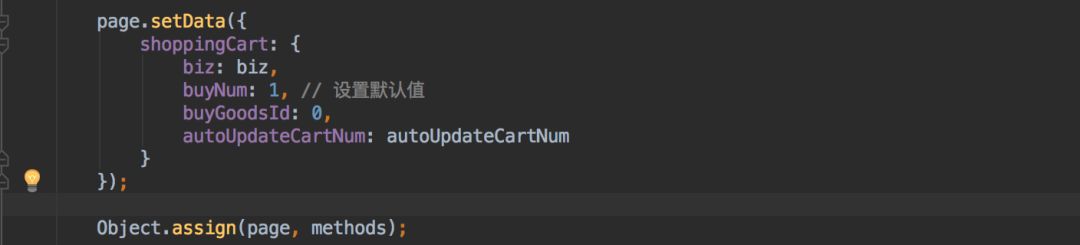 上面setData的时候,定义了shoppingCart对象,在它里面再定义具体的购物车组件需要的数据变量,而下面Object.assign一句就是把组件的方法挂载到当前使用组件的page上面去。
