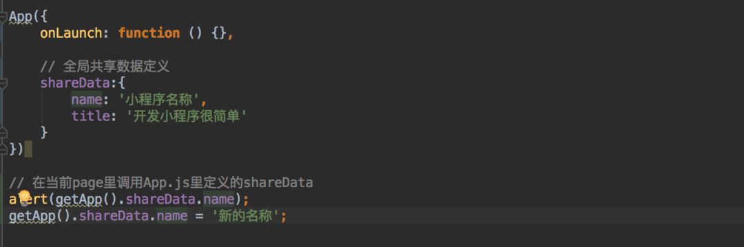 2、基于内存的数据共享:getApp方法,获取全局的App实例对象,可以设置存取这个实例对象属性来实现数据共享,如下: