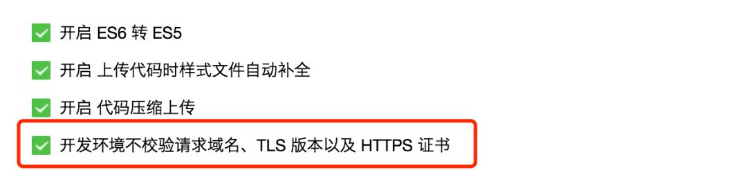 小程序要求所有请求接口都必须是https的,而且所有的域名都需要在小程序管理后台去添加,如果碰到没有添加的情况,开发调试阶段可以在小程序开发工具的项目一栏下,把下面这句勾选,不过上线之前是一定要添加的,不然会出现本地怎么调都是好的,到了手机上就是不行。