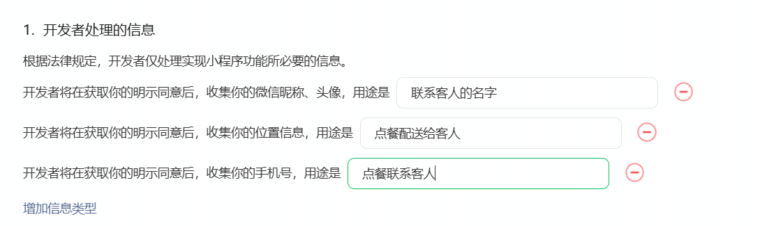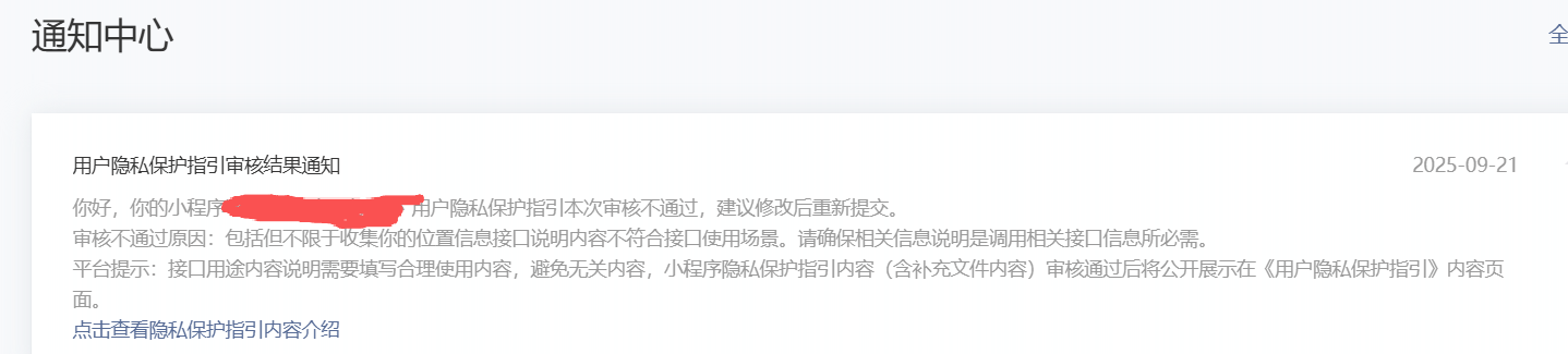 小程序类目为酒店住宿,小程序用于客人在房间下单购买零食饮料。用户隐私保护指引审核结果通知总是不通过,需要怎么调整