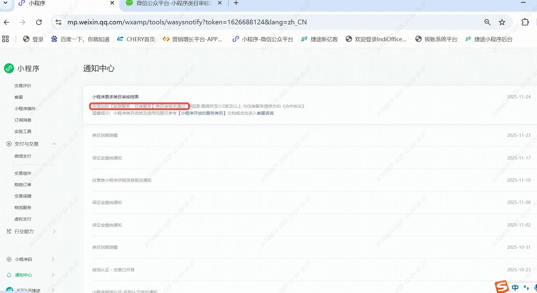 小程序通知与账号设置里服务类目的具体状态相互矛盾,是不是通知中心通知出错了?