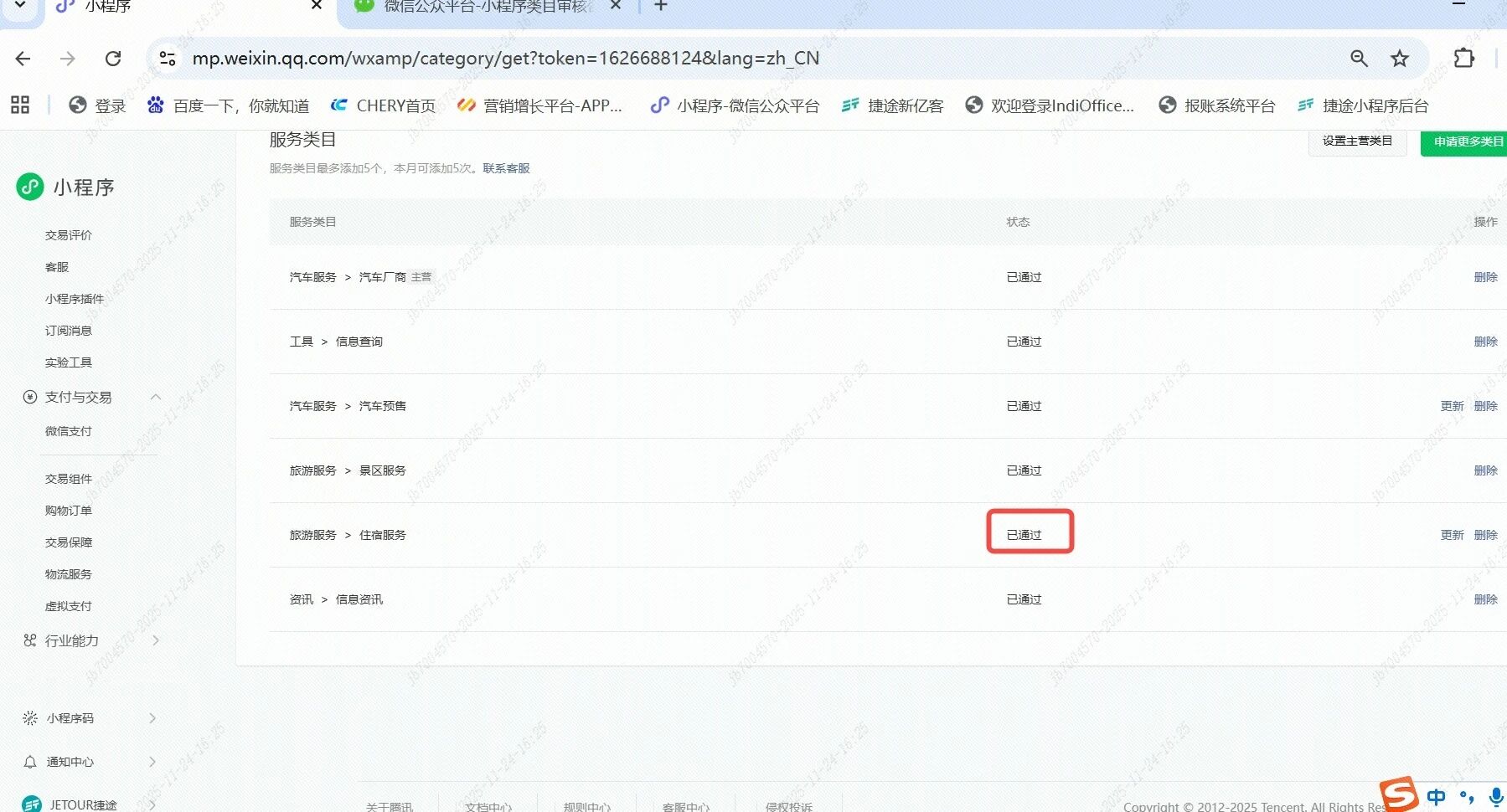 你好,经核实,小程序11.24日申请的【旅游服务-住宿服务】类目因仅提供了一家住宿服务方的相关资质,故审核不通过,最新申请的类目已审核通过,建议以小程序通知中心结果为准。