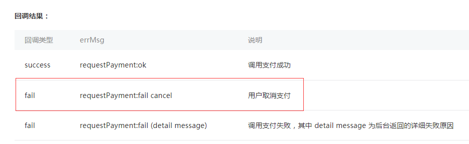 跳转到插件支付功能页面后,支付成功后能执行成功回调,支付失败会执行失败回调,但是取消支付没有执行失败回调;插件支付功能页取消支付是否会触发fail回调?