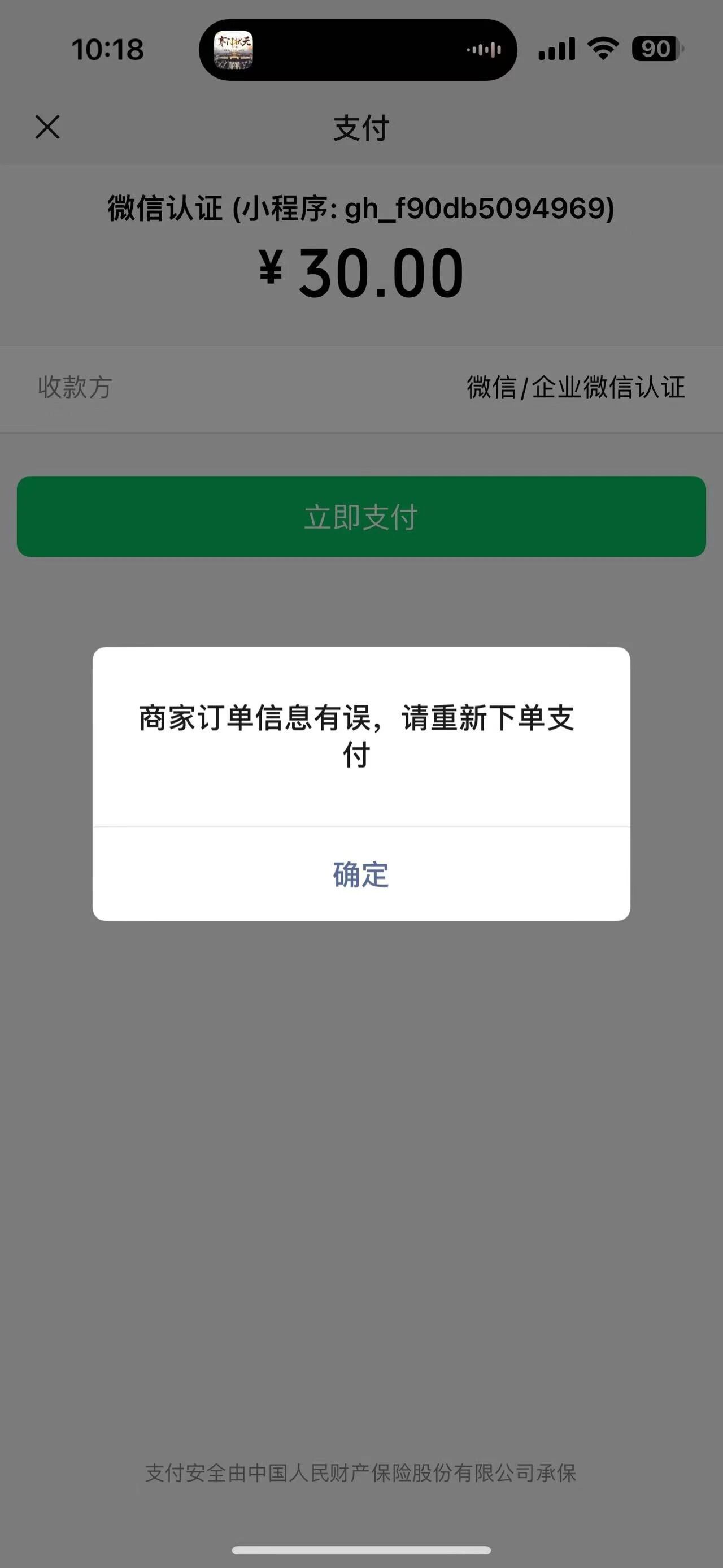 新注册公司(个体工商户),在微信小程序认证支付 30元费用时,总是报 “商家订单信息有误,请重新下”