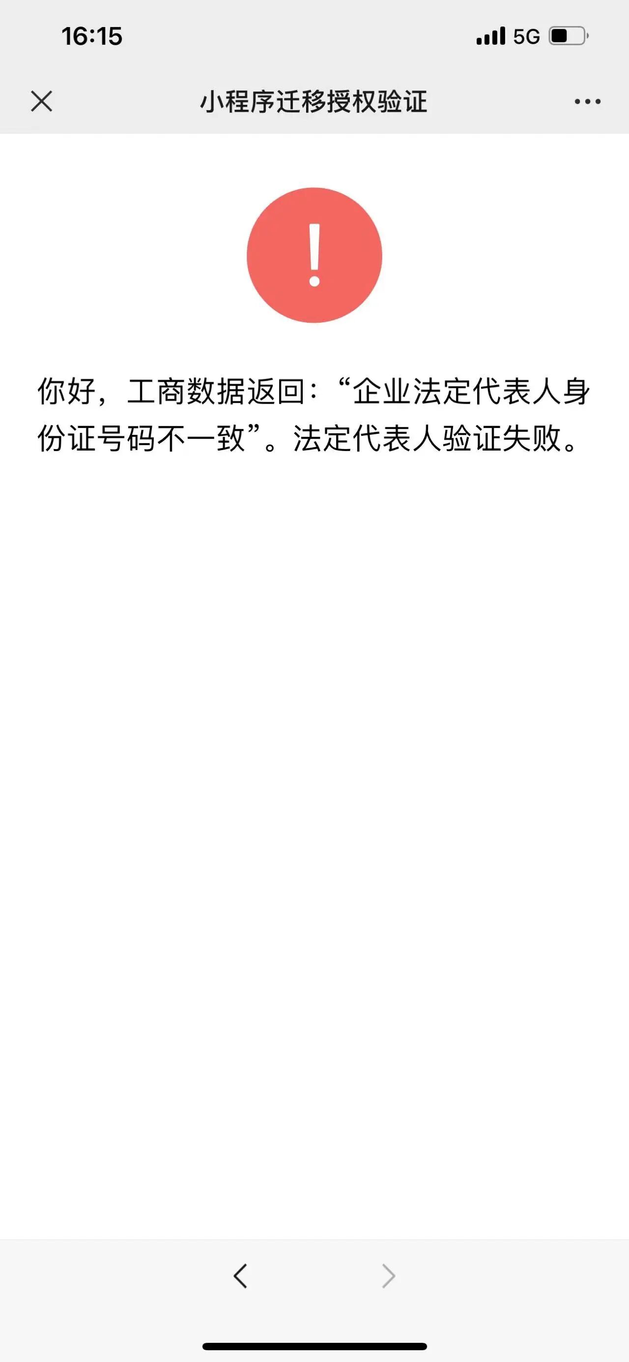今天在迁移微信小程序时,新主体在微信扫码认证时,返回【你好,工商数据返回:“企业法定代表人身份证号码不一致”。法定代表人验证失败。】