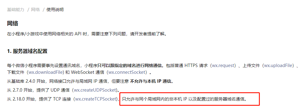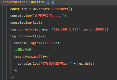 API-网络/TCP通信/TCPsocket,本机IP地址192.168.10.77,后端局域网IP地址192.168.10.221,使用TCP调试工具监听60000端口,使用开发者文档例程连接测试没有反应。 const tcp = wx.createTCPSocket() tcp.connect({address: '192.168.10.221', port: 60000})