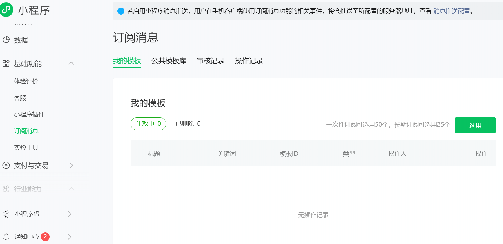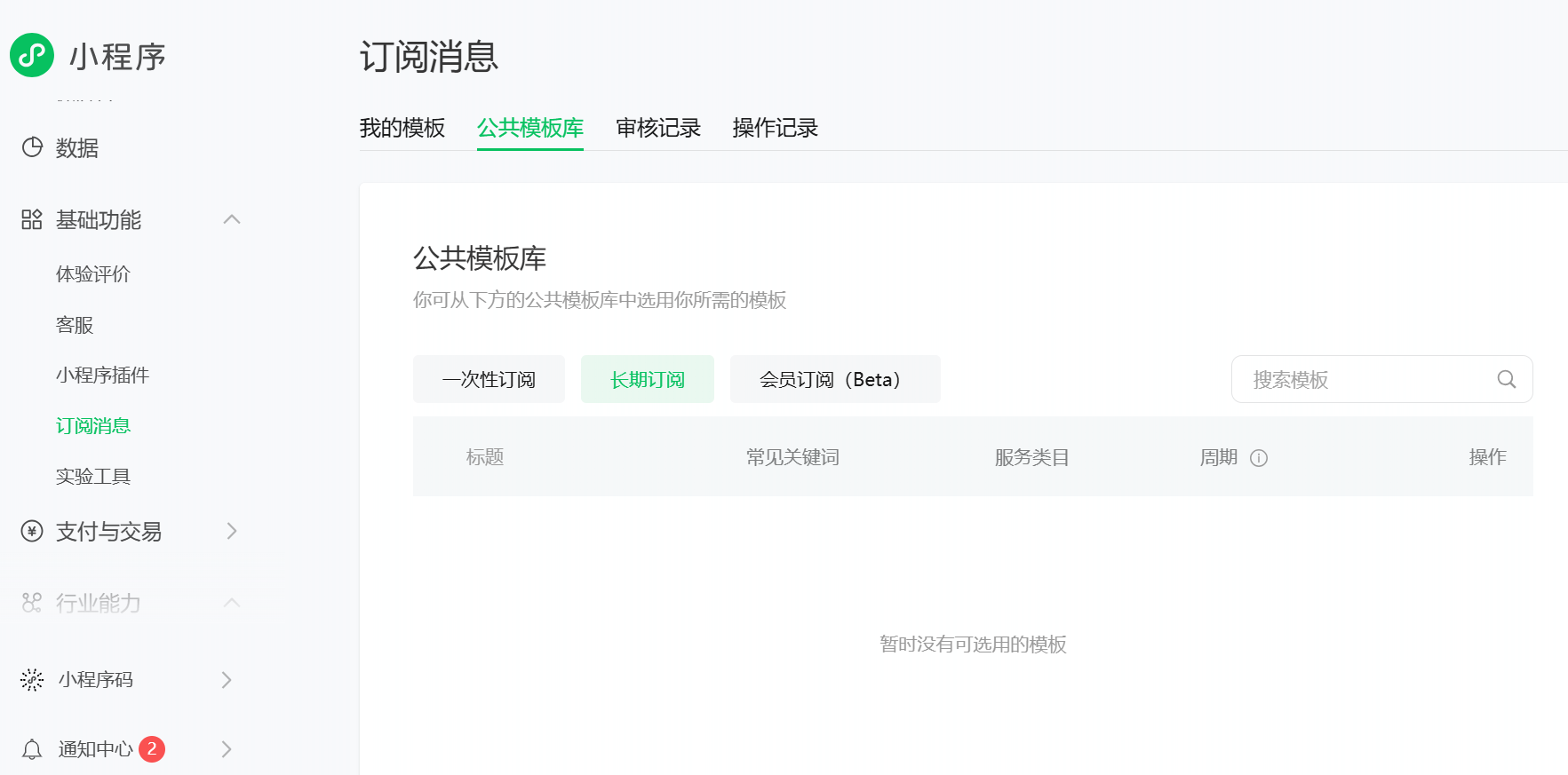 图例2-3:在订阅消息-我的模板/公共模板(长期)等板块中依然没有展示可用的长期模板