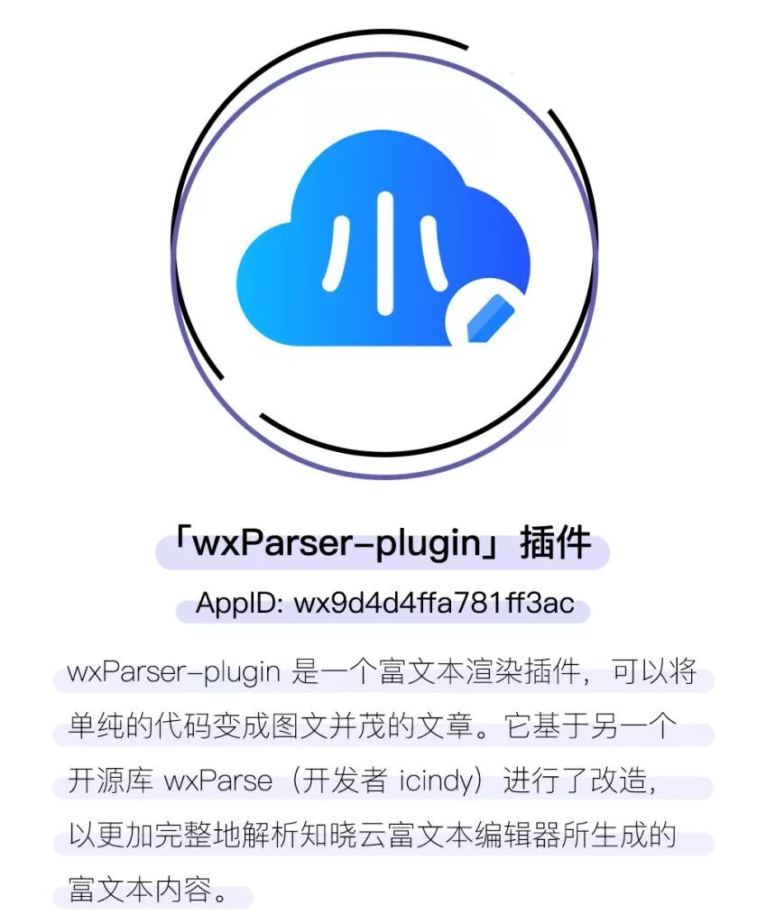继知晓云 SDK 小程序插件后,知晓云又发布了 wxParser 的小程序插件版本 wxParser-plugin,经过对 wxParser 进行一层封装后,解决了 wxParser 使用起来太过麻烦的问题。