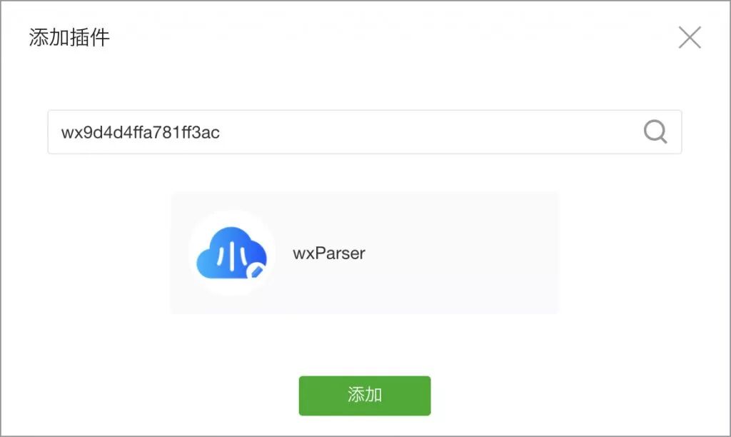 1. 在微信小程序管理后台,按 AppID (wx9d4d4ffa781ff3ac) 搜索到该插件,并点击添加,即可在代码中使用 wxParser-plugin 了。