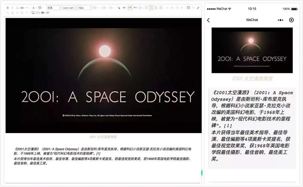 以对在知晓云编写的富文本内容进行解析为例,进入到知晓云控制台,点击左侧内容菜单项,进入内容库管理面板,新建内容,即可看见富文本编辑器。编辑的内容(左)即经过 wxParser 解析后的样式(右)如下: