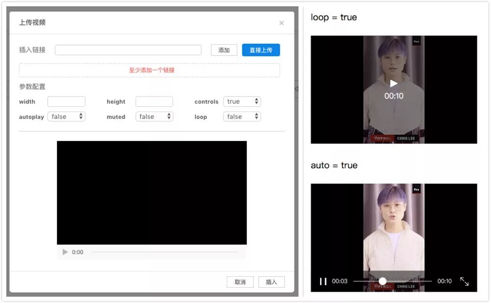 同时,配合知晓云的富文本编辑器,可以实现将图片和音视频资源上传到 CDN,使用知晓云的文件管理功能可以方便地对这些资源进行管理。wxParser 不仅仅可以解析一般的富文本内容,它也可以解析一些小程序特有的属性,如下,你可以配置视频的静音、自动播放等功能,也可以配置音频组件的海报等功能。