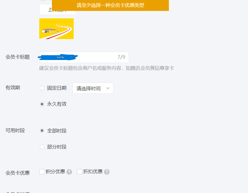 我司会员卡没有优惠,新建时就是如此。可是今天公众平台-卡券-会员卡修改了其他文案时,编辑保存时提示一定要选优惠类型。该如何解决?