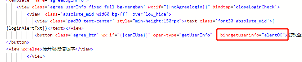 我查到原因了 因为这个按钮在一个 我用template 引入的模板里面 ,只要我把按钮直接放在页面上 ,就可以执行回调 ,但是这个有个问题是,我模板引入的 ,不是和放在页面上的 ,没区别的 么 。我记得早些时候,代码是可以执行 的 ,不知道官方又修改了 什么。我之所以用模板 ,是因为想公共引入 ,授权发起弹框页面要动态配置文字什么的 。现在这么一来 ,我就只能放在页面上了 ,不能多个页面公用引用了