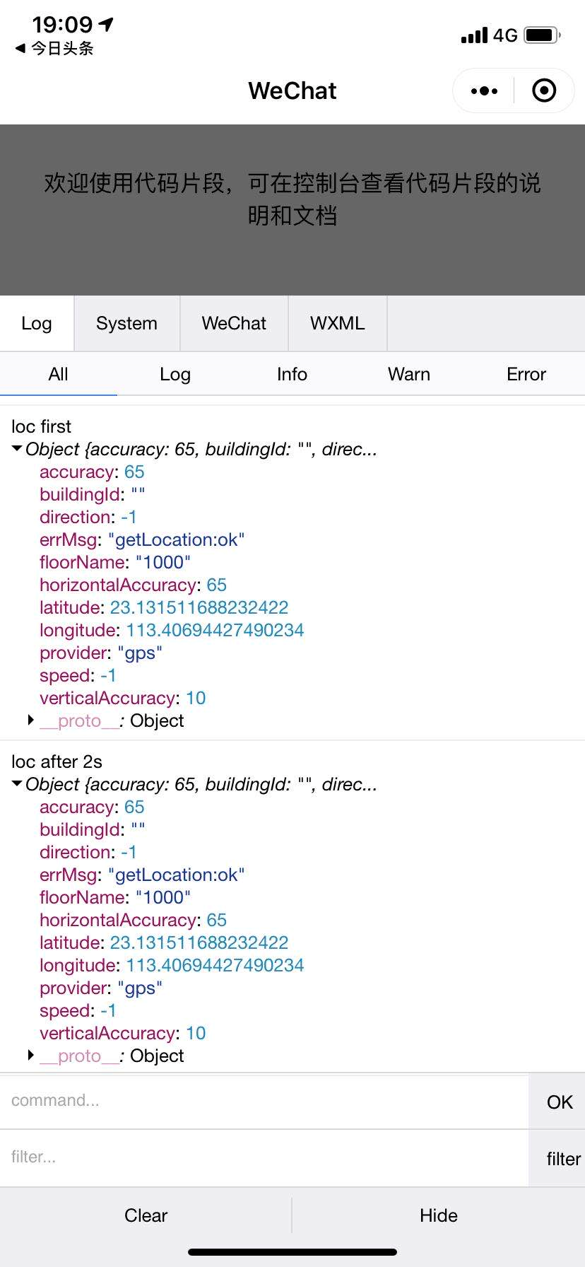 昨天我是在真实小程序里测试的,那个小程序启动时会调用wx.getLocation({type:'wgs84'}),实验的第一次应该是启动时调用结果的缓存,应该是符合预期。