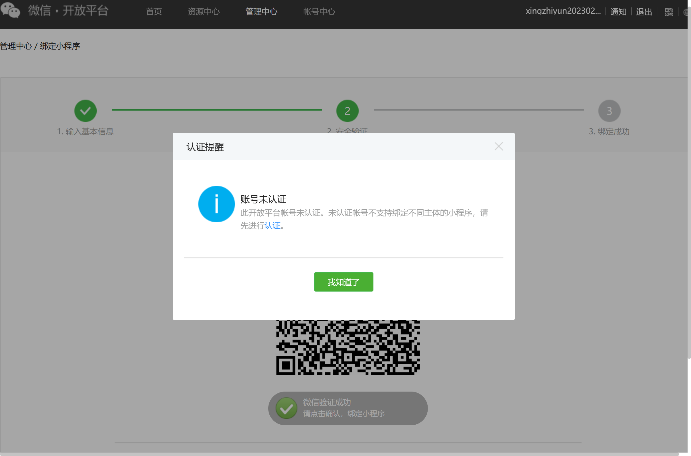 开放平台未认证的默认是个人号,只能绑定个人号小程序。