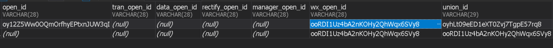 这里open_id是小程序id,wx_open_id是公众号id,该用户有两条数据,一条为小程序进入的数据,另一条为公众号进入的数据