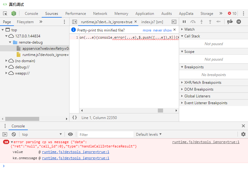 以前的项目真机调试好像没看到此错误提示,今天重新新建了一个小程序(系统默认),直接真机调试,也出现此错误,不知道是为什么,似乎对程序整体运行没什么影响,但是强迫症见不得报错,大佬可以请教下么?