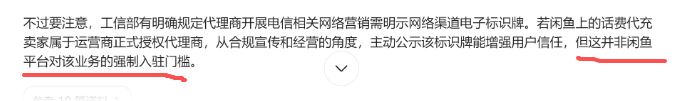 平台标注的封禁条款对应的违规情形,与本账号实际运营行为存在偏差。本账号未直接开展话费直充等需强制公示电信运营商网络渠道电子标识牌的业务,仅为话费代充服务,仅提供信息撮合,由用户与用户之间完成交易。并且在收到通知时第一时间删除下架相关有关联的业务
