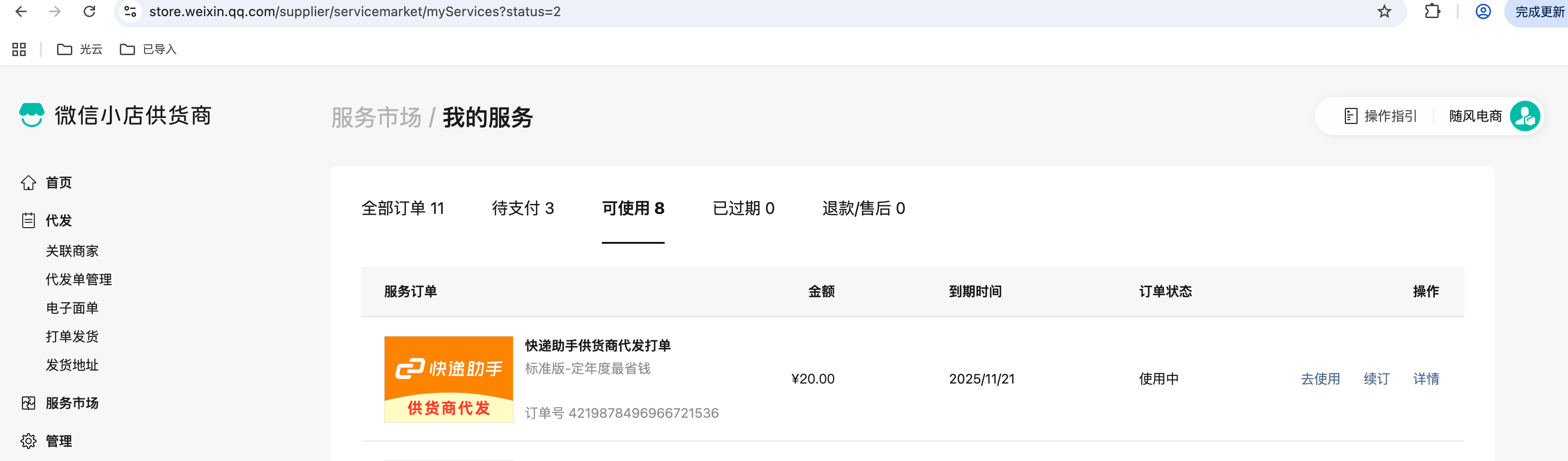 登录用户的账号可以查到服务市场订单,但是去拉取服务市场订单拉取不到。 其他接口是可以拉取到数据的,例如代发订单接口就可以拉到。