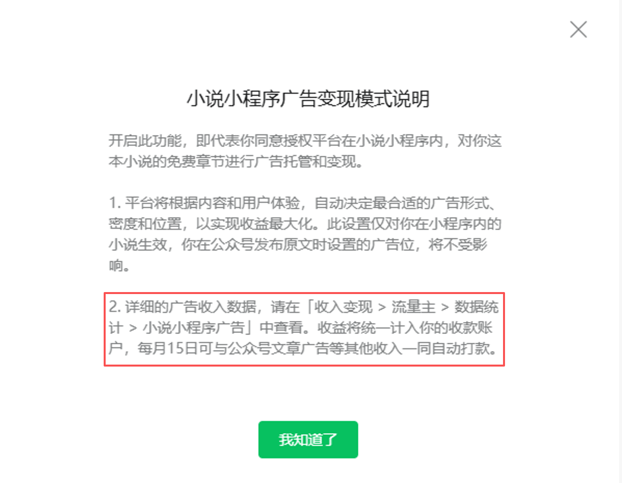 详细的广告收入数据,请在「收入变现>流量主>数据统计>小说小程序广告」中查看。